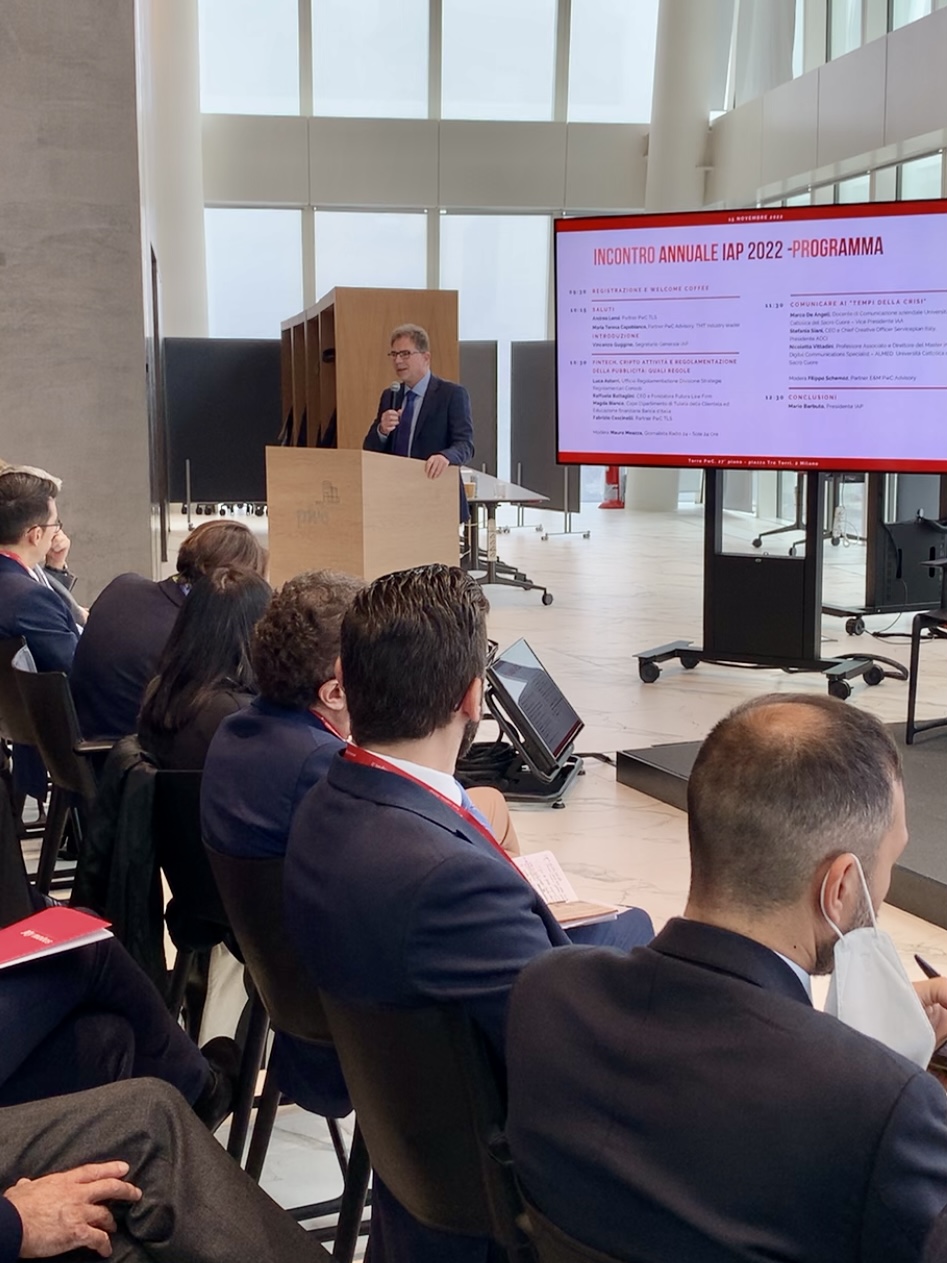 Luca Astorri di Consob ha fatto il punto sulla proposta di regolamentazione europea della materia indicando anche i tempi ancora lunghi perché si possa arrivare ad un framework regolatorio chiaro, ma ricordando il ruolo che può avere l’autoregolamentazione; Magda Bianco di Banca d’Italia ha illustrato l’attività dei controllori nell’attesa di strumenti legislativi espliciti, facendo leva sull’importanza dell’educazione finanziaria nei confronti dei consumatori e dell’autoregolamentazione da parte degli operatori. Raffaele Battaglini di Futura Law Firm e Francesco Della Scala di PwC hanno illustrato il punto di vista degli operatori che si rivolgono alla consulenza per inserire nei propri business iniziative legate alle cripto-attività e delle loro esigenze di regole chiare e linee guida operative.