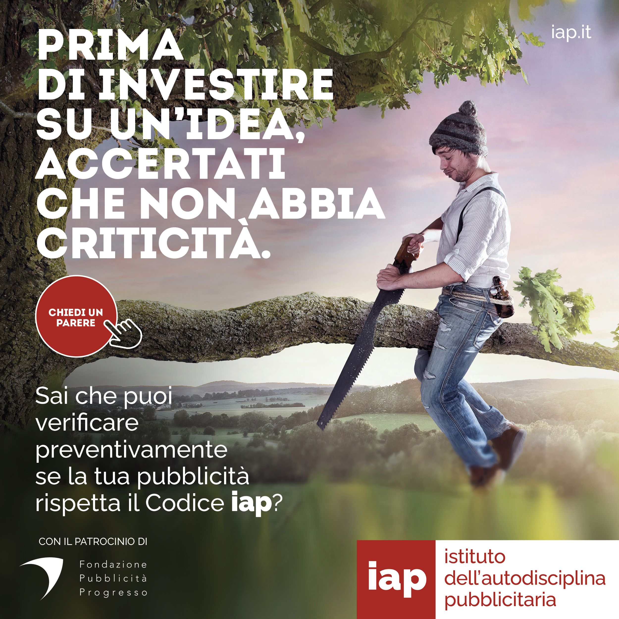 L’idea posta al centro della campagna è semplice ma di grande forza per chi fa pubblicità e vuole farla in modo corretto. Prevenire spiacevoli incidenti di percorso grazie agli strumenti messi a disposizione dallo IAP agli operatori: per verificare la correttezza dei messaggi prima della loro diffusione; per tutelare la creatività da possibili “sottrazioni di idee”; per ristabilire la “giustizia” in caso di concorrenza sleale. Si tratta di servizi che contribuiscono in modo sostanziale a innalzare il livello qualitativo della pubblicità in Italia, anche come prova di assunzione di responsabilità degli operatori, essenziale per un comparto etico e trasparente.